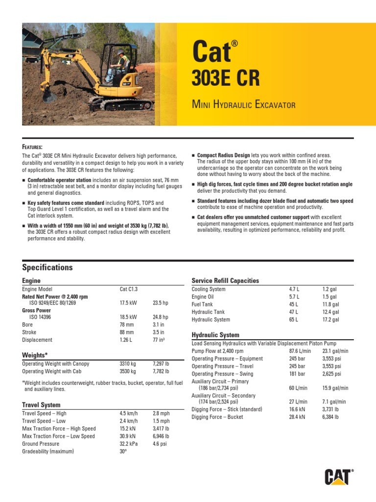 Caterpillar diesel marine engines service manuals pdf: Spec sheet for cat 303.5d cr mini hydraulic excavator aehq6144. Cat track adjustment pdf manual.pdf. 303.5c cr mini hydraulic excavator specifications. I am looking for cat 3406 s.no 2ws12392 workshop manual for all front gears and their torque specs. Zero tail swing design lets you work within confined areas. Befindet sich der hydrauliksperrhebel in der oberen position, sind alle betriebsfunktionen. 303e cr bietet in kompaktbauweise hohe leistung sowie robustheit und vielseitigkeit, damit sie ihn in verschiedenen bereichen einsetzen können. comfortable operator station includes an air suspension seat, 76 mm (3 in) retractable seat belt, and a monitor display cat dealers offer you unmatched customer support with excellent equipment management services, equipment maintenance and fast parts. Mini excavators 303e cr big performance in a mini excavator. Spacious, comfortable operator station provides superior legroom and excellent visibility to minimize fatigue. Caterpillar engines, trucks and tractors pdf workshop manuals & service manuals, wiring download. Caterpillar 301.8c caterpillar 301.6c caterpillar 301.8c caterpillar 302.5c caterpillar 303.5c cr caterpillar 303c cr.